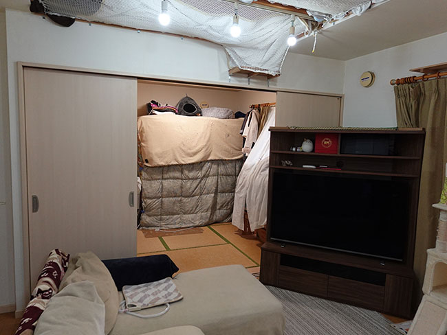 比較的ゆったりとした建物で、一階リビングの中心は吹抜け空間となってましたが、家全体の断熱を考慮して布などで覆う様な空間になり、その布のあるスペースに猫が登らないように更にネットで覆うといった見栄えも空間としての機能も失った状況になってました。
