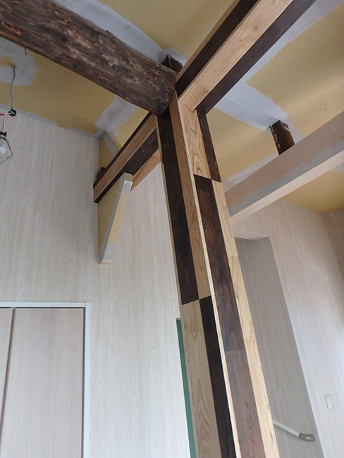 玄関の既存梁と既存柱を大黒柱のように残して、栗材でパッチワーク風に仕上げた。
