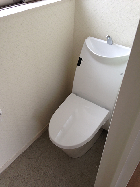 1階トイレには手洗器も設置。ストライプ柄の壁紙が明るい印象を与えてくれる。