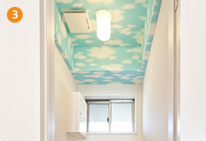 明るい雰囲気の2階トイレは青空模様の天井が印象的。夜になると夜光塗料によって、星空が広がります。もともと2階にはトイレやお風呂はありませんでしたが、プライバシーと使い勝手を考えて、新たに設置しました。