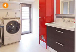 ランドリースペースは、白を基調に明るく清潔感のある空間に仕上げられています。奥に見えるドアは勝手口になっており、ご両親が住む1階を通らなくても、外出することができる設計です。