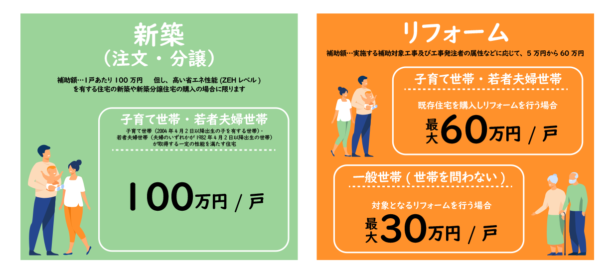 こどもエコすまい支援事業は、エネルギー価格高騰の影響を受けやすい子育て世帯・若者夫婦世帯による高い省エネ性能(ZEHレベル)を有する新築住宅の取得や、住宅の省エネ改修等に対して支援することにより、子育て世帯・若者夫婦世帯等による省エネ投資の下支えを行い、2050年のカーボンニュートラルの実現を図る事業です。