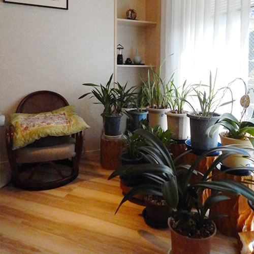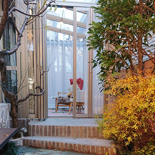 サンルームの外に基本的には花の咲く、あるいは葉の色や形に特徴のあるものを植栽しました。