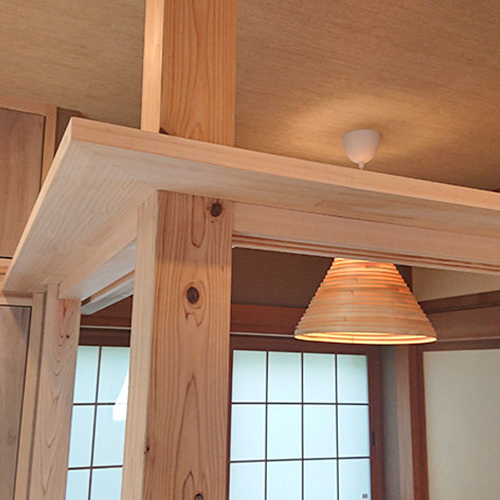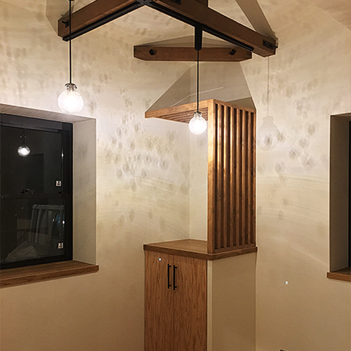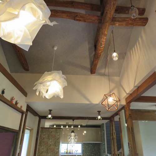 高い吹抜けに梁を表わして、可愛らしい個性的なペンダントライトを下げました。古民家の雰囲気をもちつつオシャレな空間です。