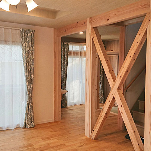 耐震用の筋違いをリビングとダイニングを分ける間仕切りにしました。新築にはない、リノベならではのオシャレな見せ方です。
