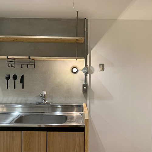 既存のシンク付きキャビネットと換気扇を再利用しつつ、吊戸棚を撤去しキャビネットに木材を合わせ、カフェのような雰囲気に。
