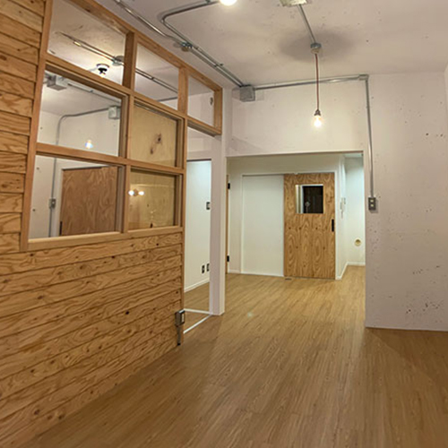 無機質になりすぎない様、建具や壁の一部に構造用合板を施しました。室内窓のある間仕切り壁がプライベート空間と共有部分が視覚的に開放的でラフな印象を与えてくれます。