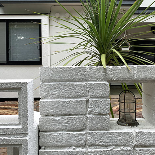 ブロック塀とホローブロックは白で塗装。圧迫感のない、開放的な境界を作りました。庭に植えた青ドラセナのグリーンを引き立てます。