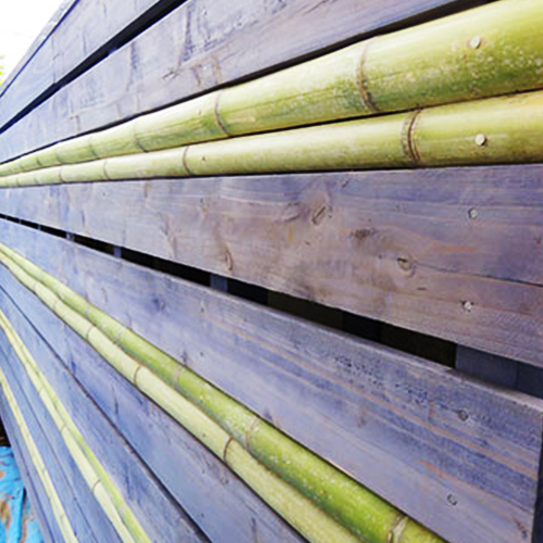 紫に塗装した板の間に竹を入れました。遊び心溢れる、個性的でユニークな塀となりました。
