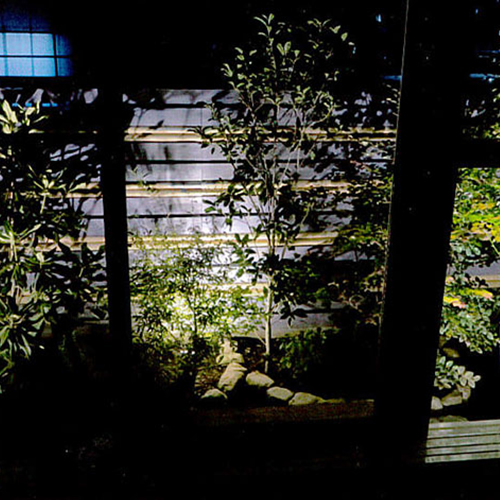 ガーデンスペースを夜も楽しめるように、ライトを設置。ライトがあたると雰囲気が全く違くなります。