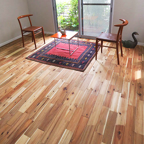 アカシアのフローリングの赤身と白太と節のコントラストが個性的でオシャレです。赤い家具がとても映えます。