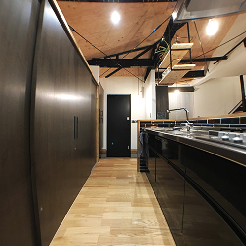 キッチンの背面は造作の収納。この中に食器やキッチンの道具、家電も収めてスッキリさせました。鉄骨を表わしにしたブルックリンスタイルが素敵です。