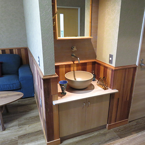 介護の事を考えて、主寝室に洗面台を設置。無垢材で出来た腰壁がアクセントになりつつも落ち着く空間となっています。