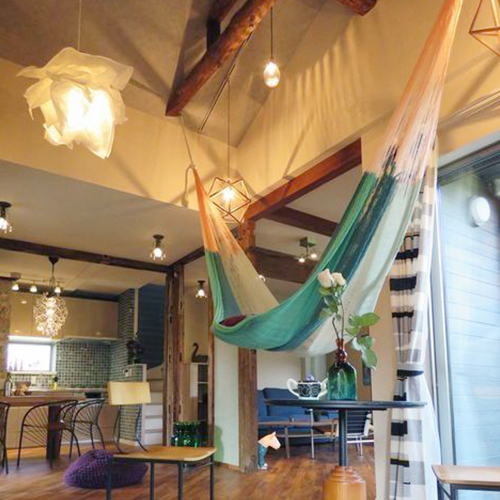 現しにした梁にハンモックを取り付けました。築50年でも充分な耐久性があります。