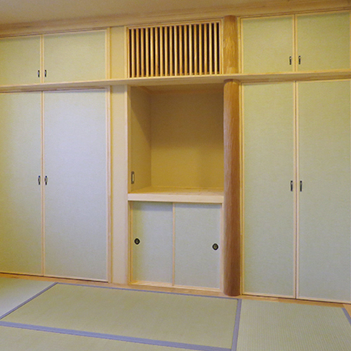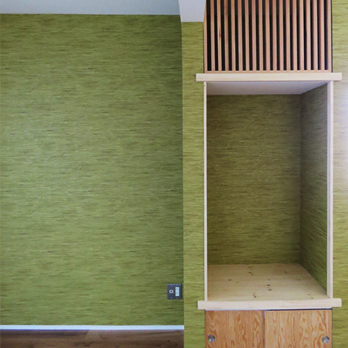 洋室の壁に緑色の和紙のようなアクセントクロスを貼りました。そこに雰囲気にあう仏壇スペースを造作しました。