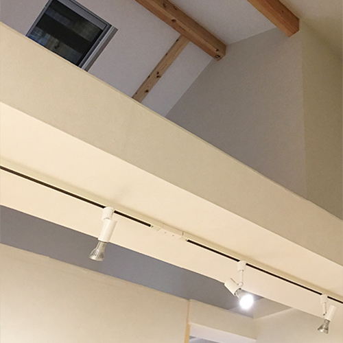 梁を表わしにした吹抜け天井。梁にライトを取り付け部屋が明るくなるようにしました。