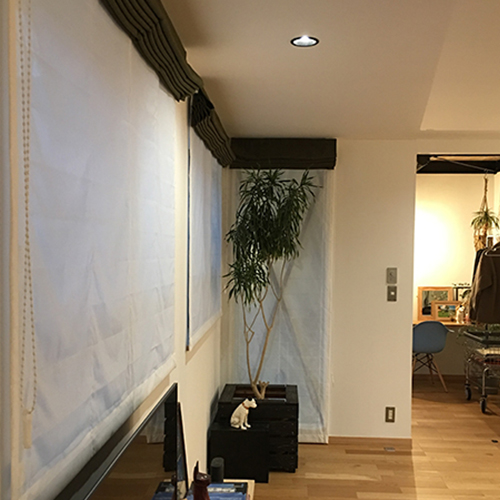 シェードのカーテンを天井近くから下げると窓全体が開放され、インテリアの邪魔にならないのでおススメです。窓枠内側に付けると上部が塞がれてしまってより存在感が出てしまいます。