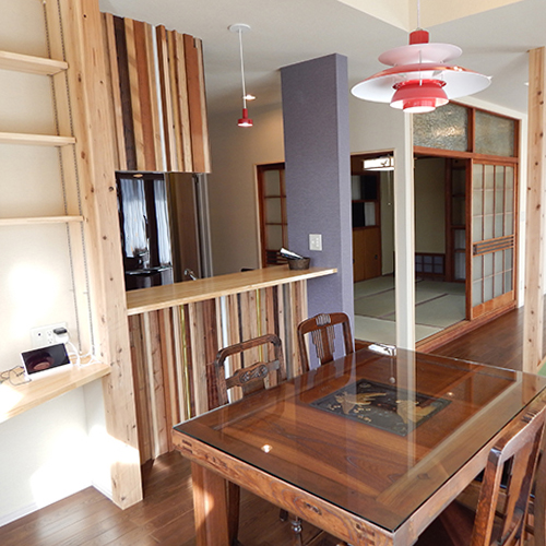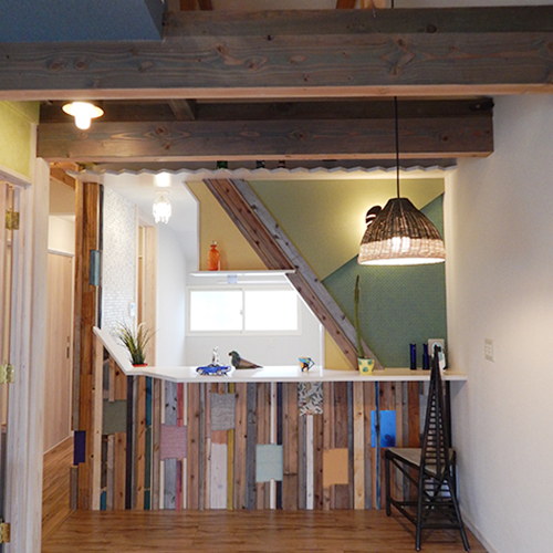 ダイニングカウンターの腰壁は、解体時の古材を一部再利用。色々な壁紙の上に、周囲を様々な木材で貼りました。ナチュラルで華やかなデザインです。