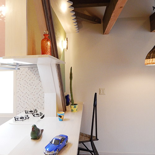 キッチンカウンターの上にはギザギザな形の飾り棚。