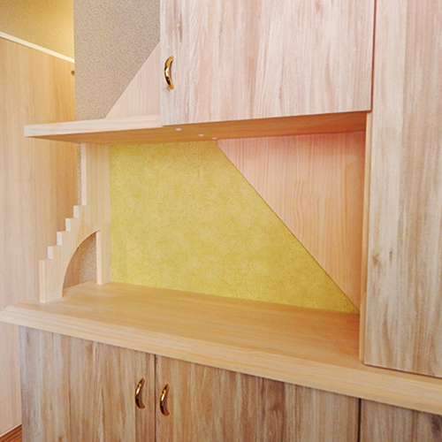 手書きのようなクロスを細かいスペースに貼りました。鳥の置物とよく合います。