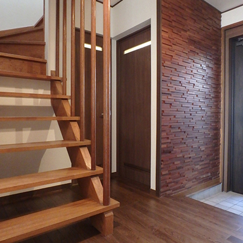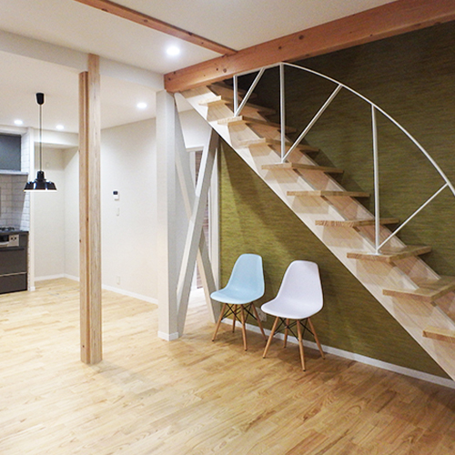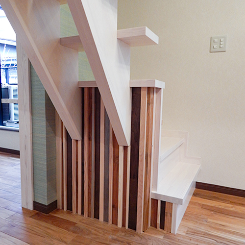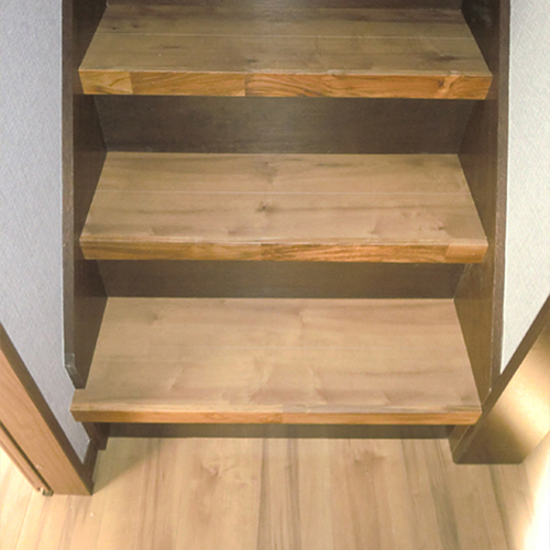 既存の階段のステップ部分に、床と同じ木材を貼りました。イメージも統一されオシャレさがアップします。