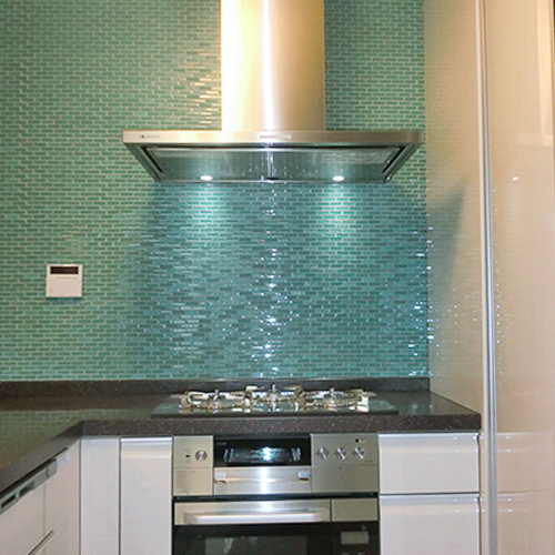 キッチンの壁にはガラスのモザイクタイルを貼りました。光が当たると、キラキラ輝いていて高級感溢れます。