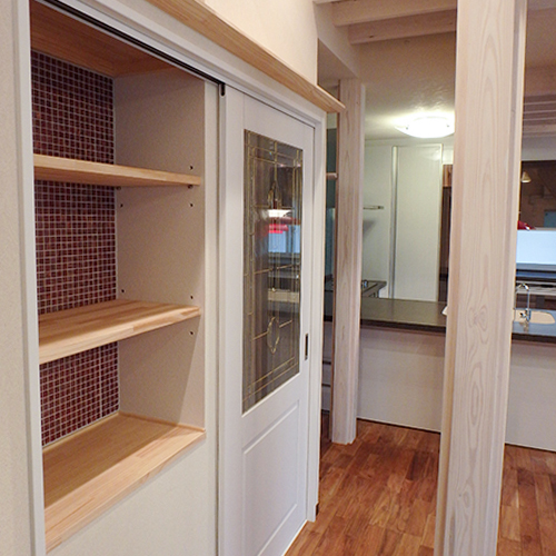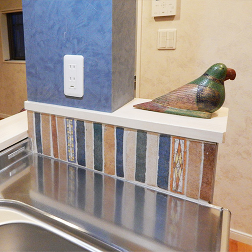リビングの飾り棚の奥にイタリア製ガラスモザイクタイルを貼りました。キラキラしていてキレイです。