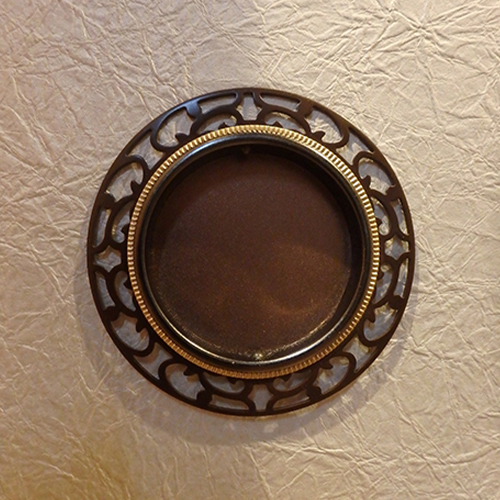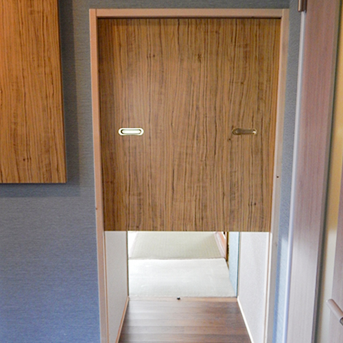 和室入口 障子襖の引手。襖紙は和紙揉み紙・鼠。