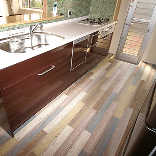 キッチンのカラフルな床材は板目塩ビタイルです。耐久性、耐水性に優れていておススメです。