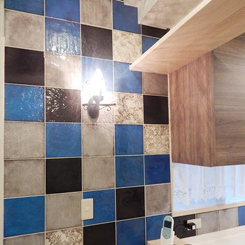 鮮やかな青タイルと黒・白のモノトーンの色合いがマッチングしています。スペイン産の素焼きタイルとアンティークな照明がよく合う。