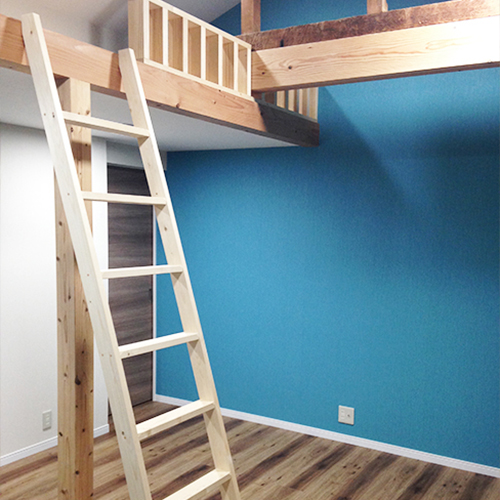 青いアクセントクロスが印象的な子供部屋。ベッド兼ロフトがあり、耐震用の補強梁が現しとなっています。