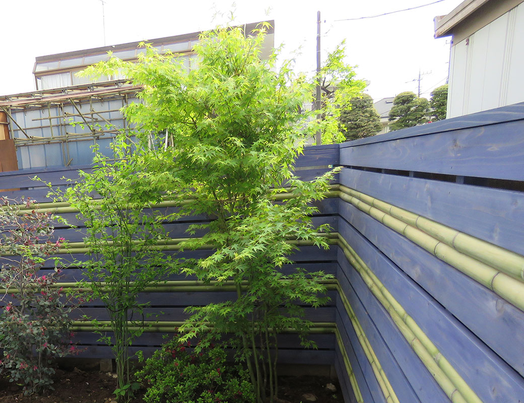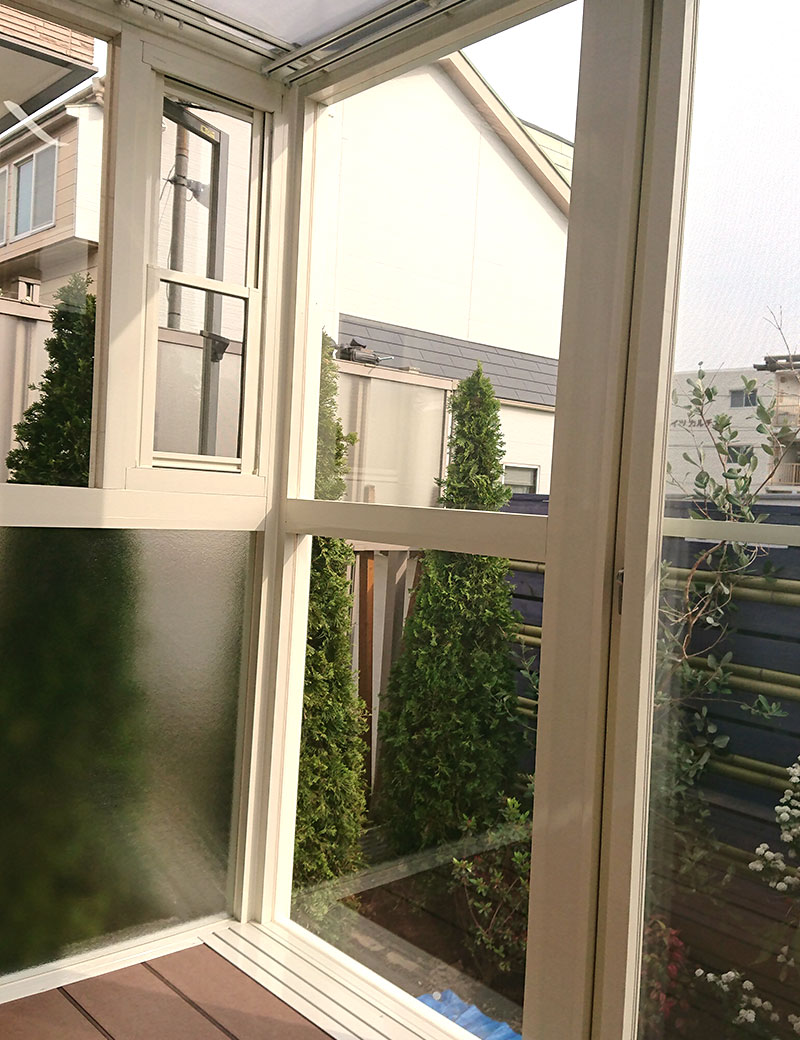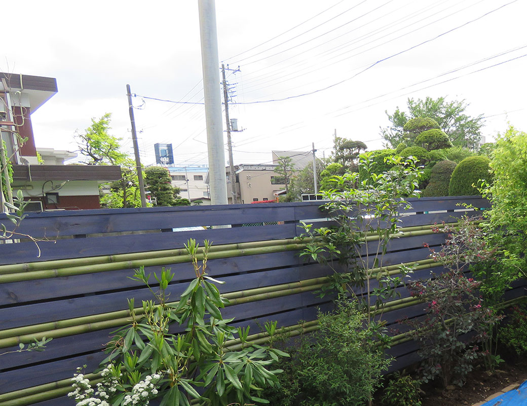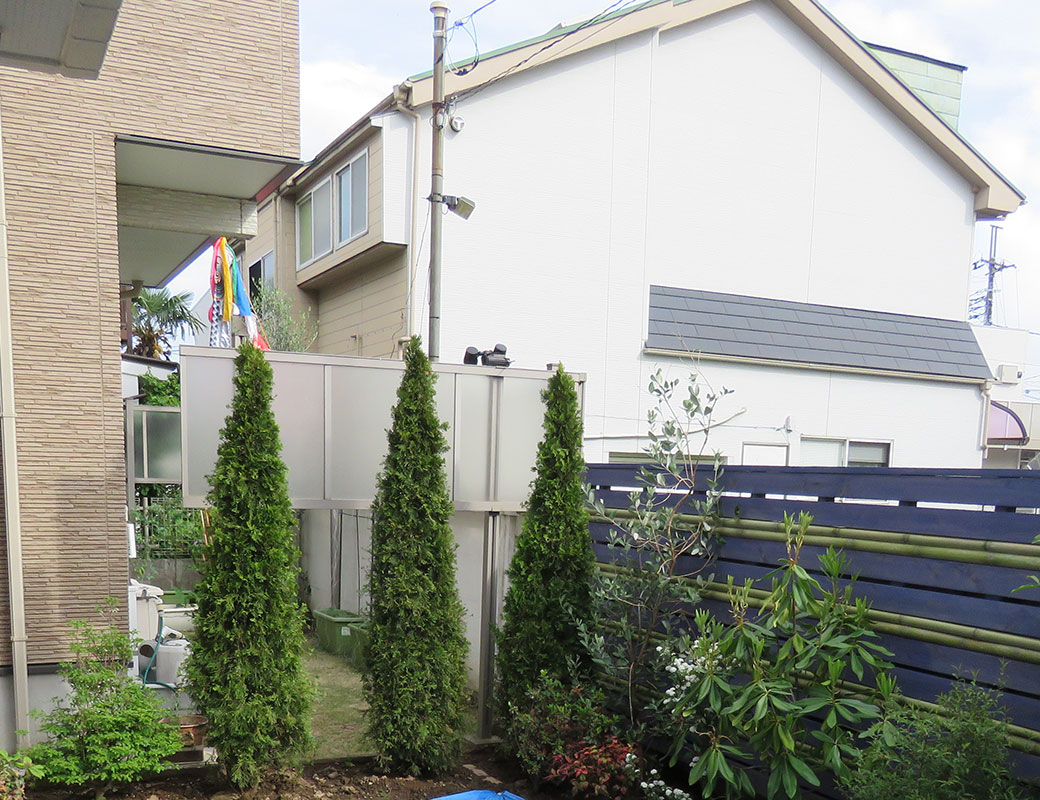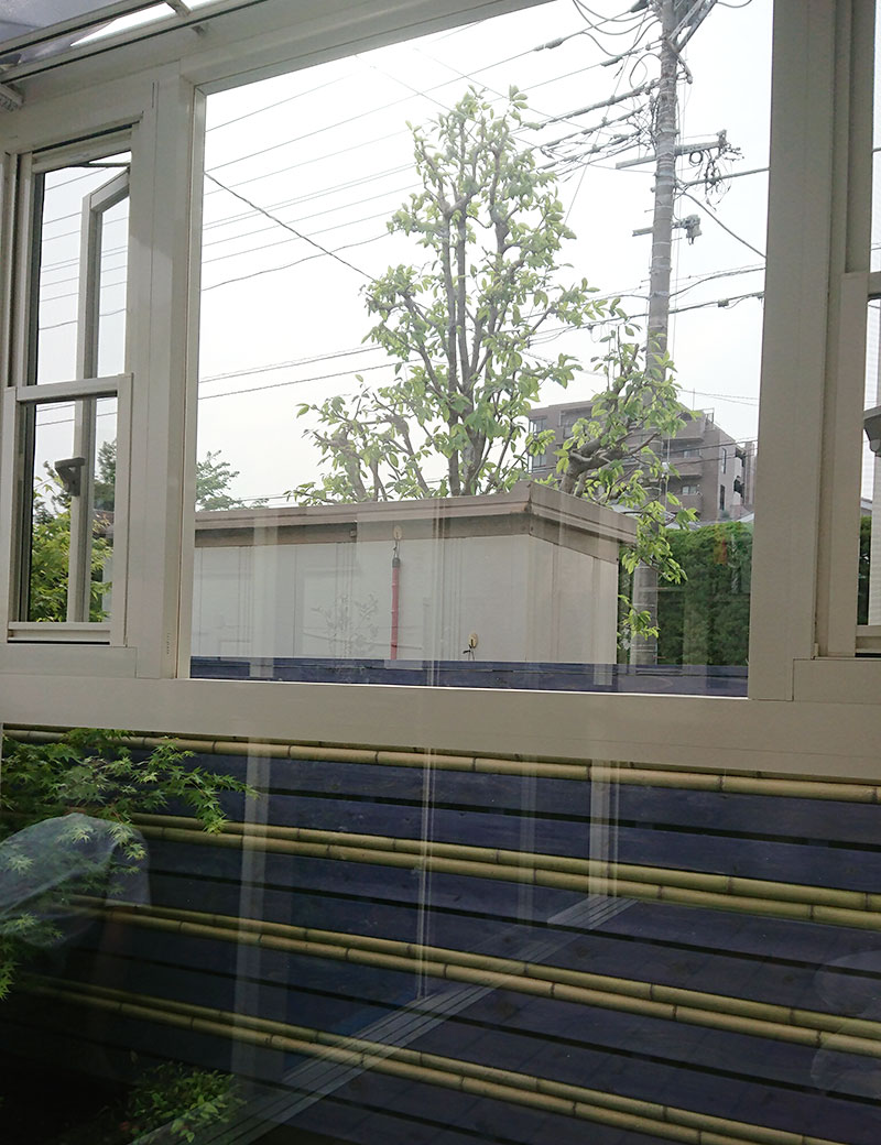 何年か前に当社の不動産部門で相続問題のアドバイスさせていただいたお客様が、今度はサンルームの交換とエクステリアの相談でお見えになりました。 サンルームはLIXIL社のサニージュFを使用。エクステリアは、既存の塀を活かして見栄えをよくプライバシーを守れるようにすることというご要望でしたが、その中に庭木や植栽を加えることによって、四季の変化が見えるような、そして自分で草花を育てていく行為を加えることによって老後の生活に活力と潤いを作り出すようなお手伝いが出来ればと、町の植木屋さんを廻り、低木から既設の草花を選んできたり、境界塀にはアルミフェンスではなく木と竹を上手に組み合わせて和でも洋でもない室内をつくるべく奔走することになりました。
