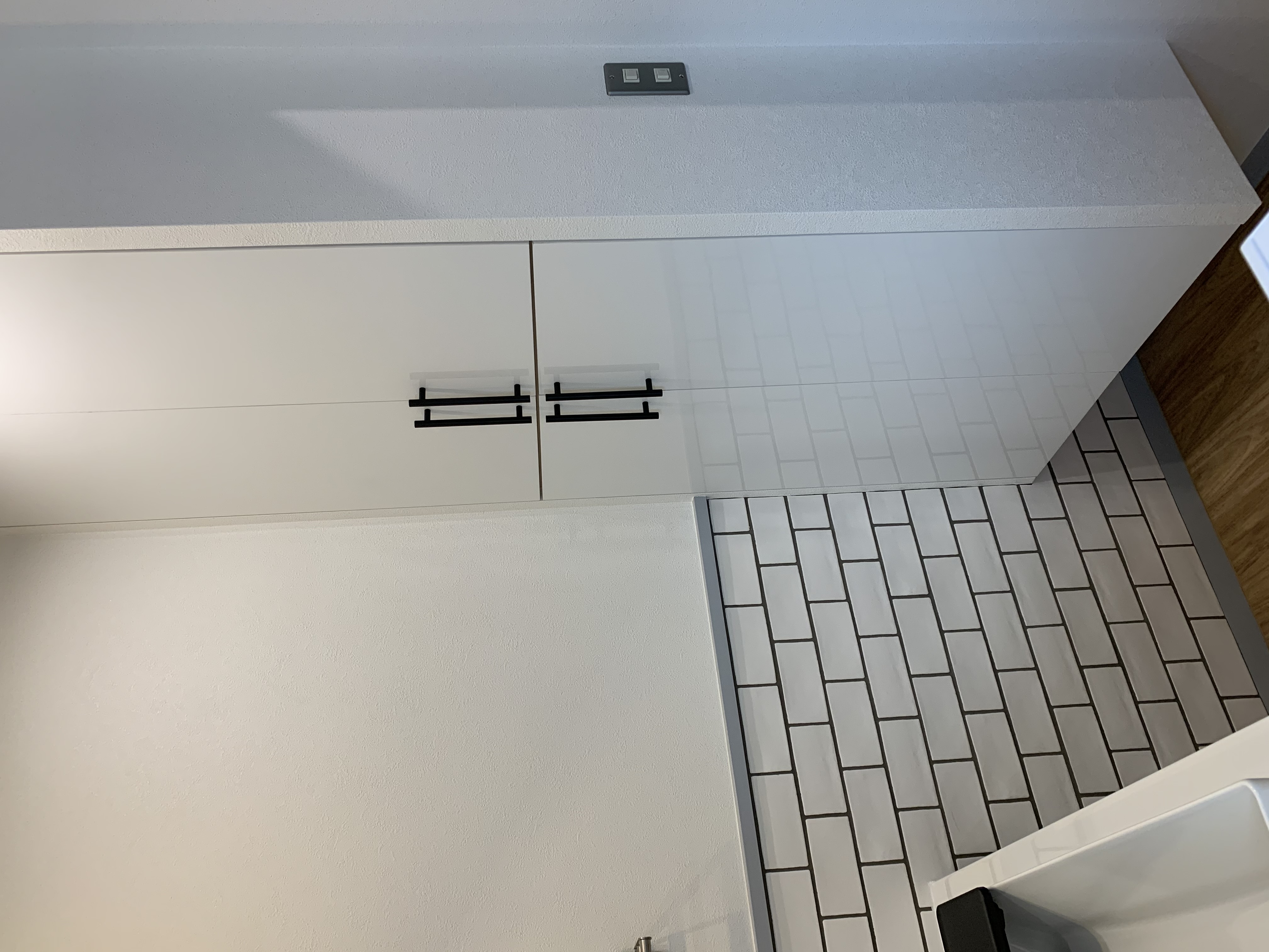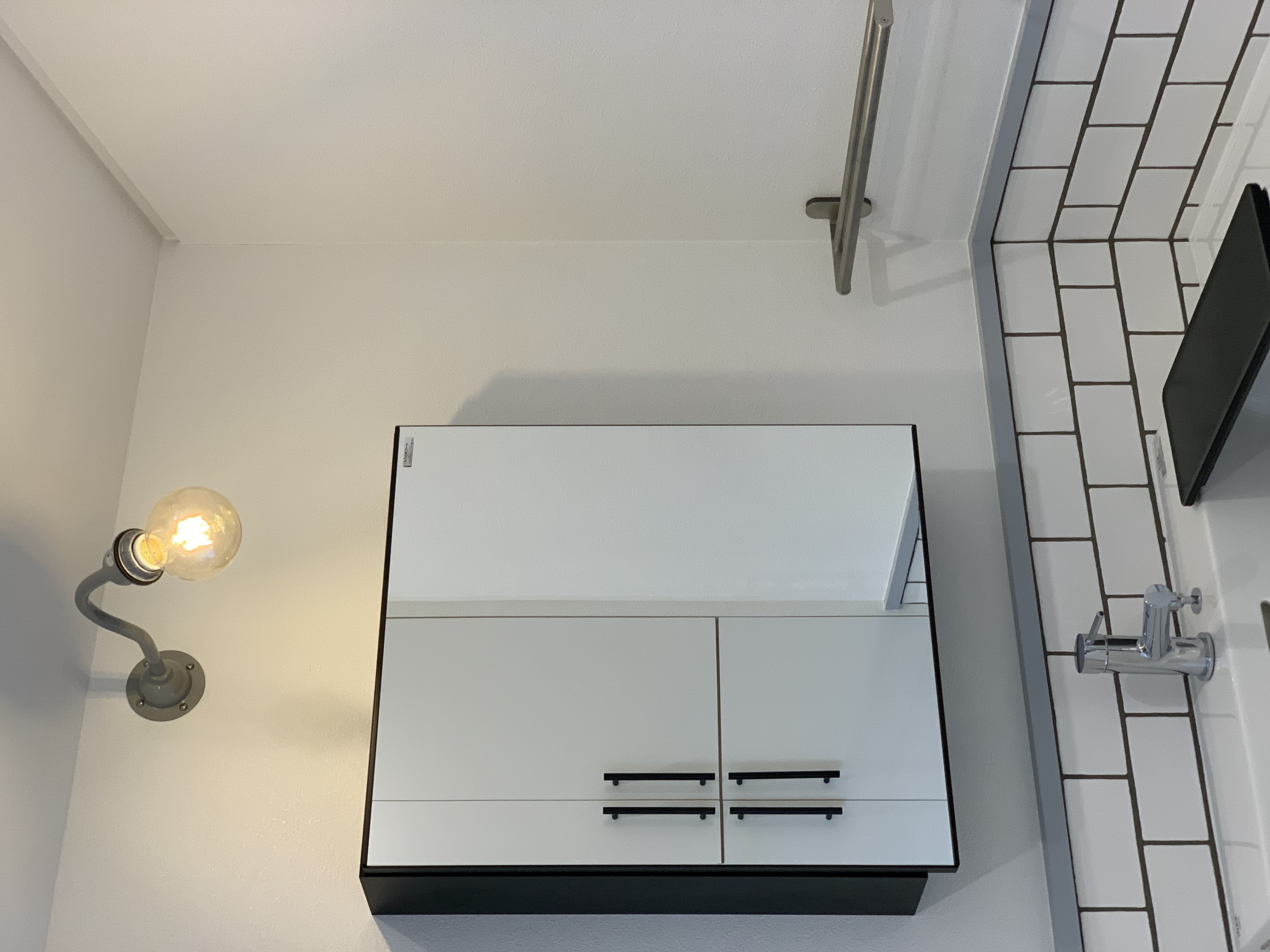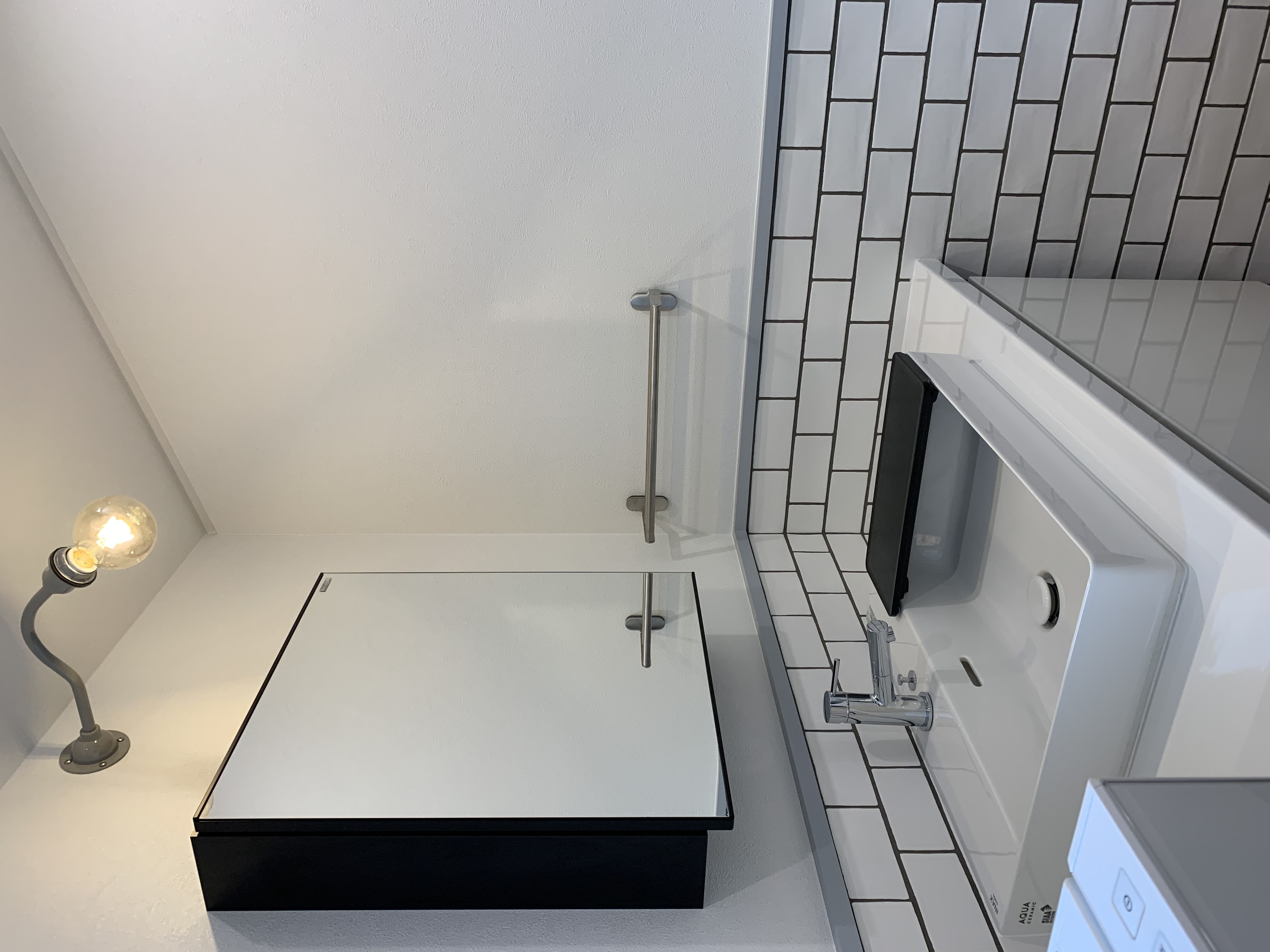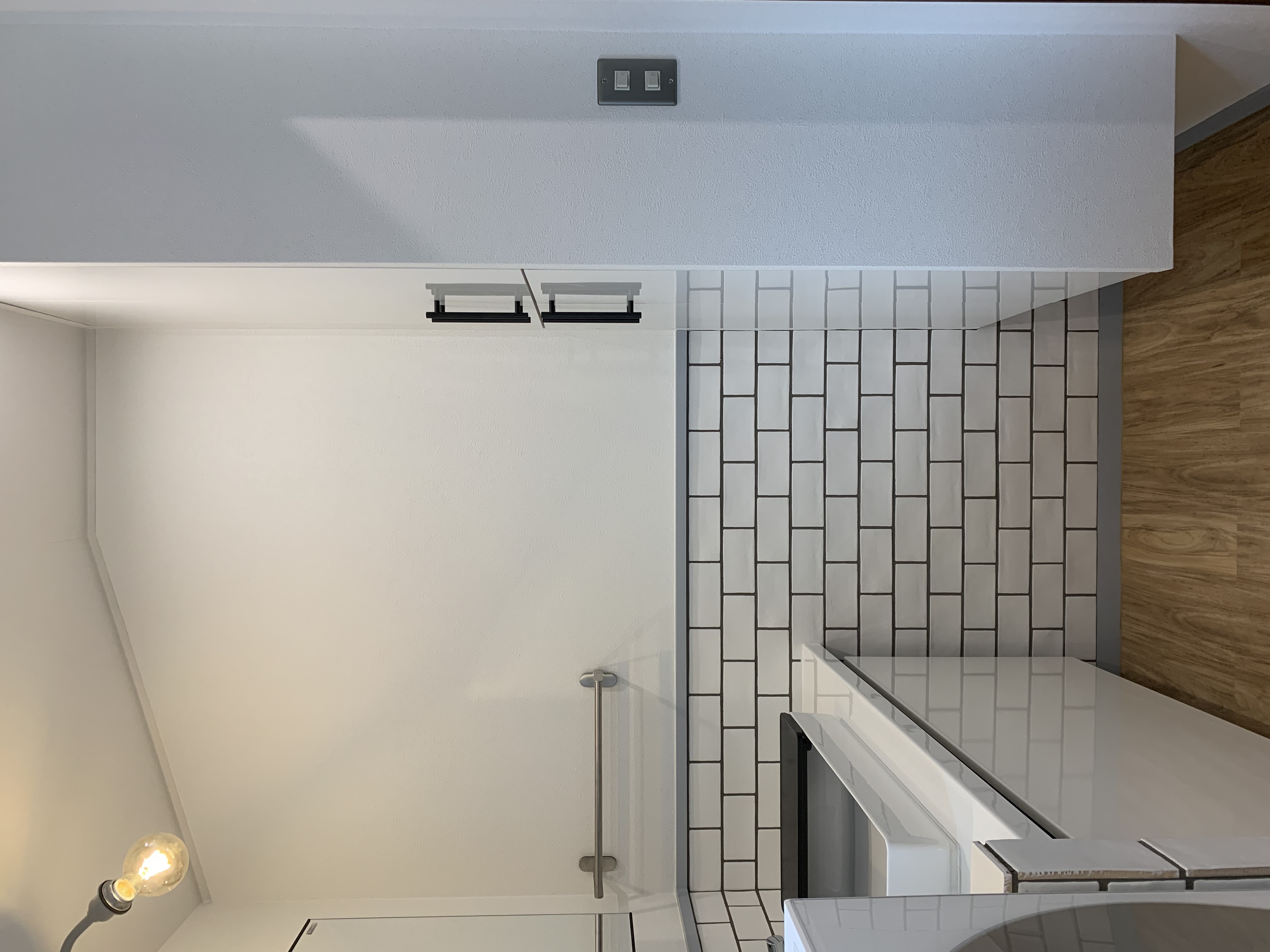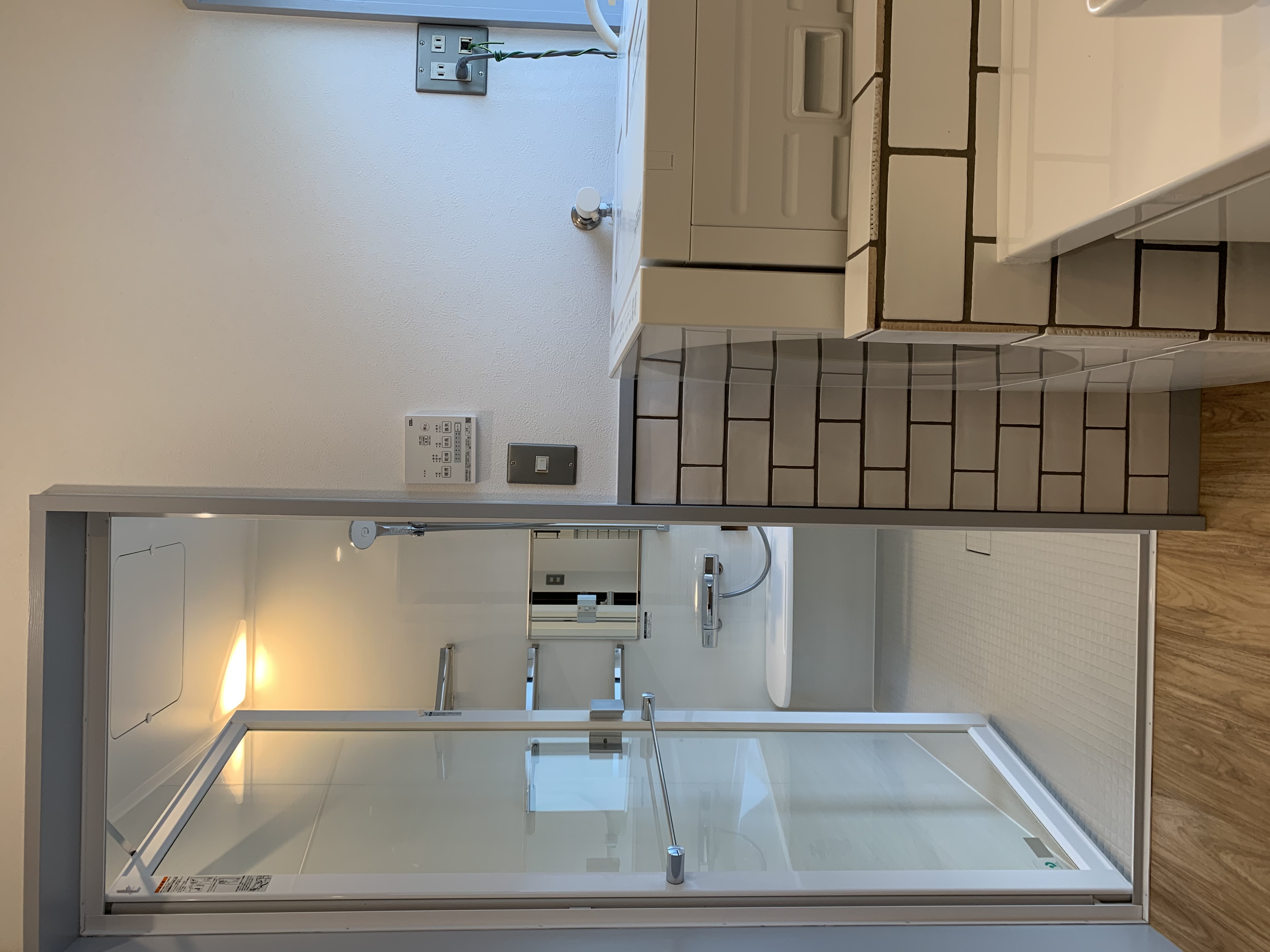 機能的でシンプル、色数を抑えたプランで進めていきました。 元々の洗面室は広いだけで、使い勝手の悪い印象があり洗面台の配置換えと間口の広い窓を半分隠して壁面を多くとれる様にしました。 洗面化粧台の対面側には天井までの高さの造作収納を設ける事にしました。 洗面室は腰壁として下側はタイル仕上げとし、シンプルで清潔感のある空間としました。 浴室ドアは透明ガラスドアにして開放的なイメージに仕上げました。